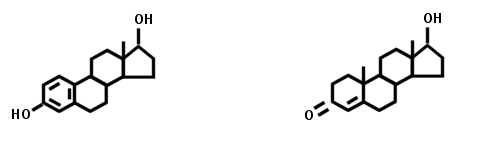 we show two hormones below. One is testosterone, the "male" hormone. The other is estradiol, the potent